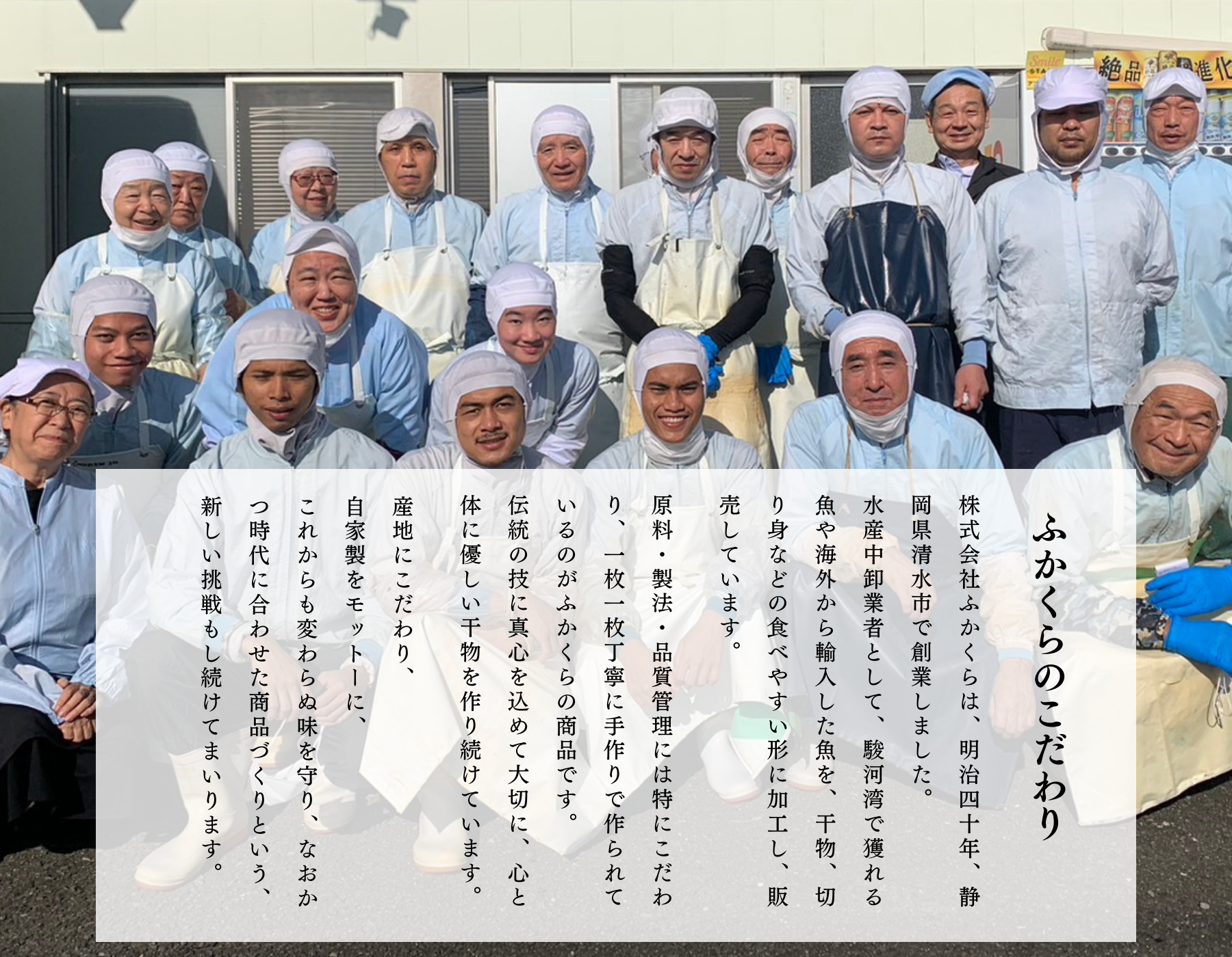 ふかくらは、明治40年この地清水で創業しました。素材の旨味を最大限に引き出し昔ながらの製法にこだわる老舗のひもの屋です。