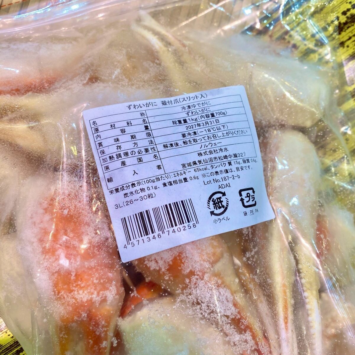 ノルウェー産のずわい蟹爪です。3L・26/30